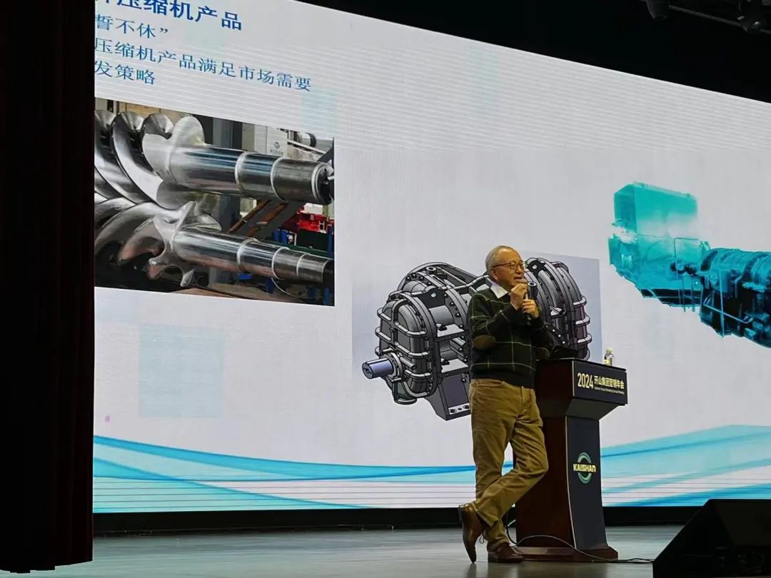下午,壓軸演講是湯炎總經(jīng)理所做的“開(kāi)山技術(shù)發(fā)展與趨勢(shì)”專(zhuān)題報(bào)告。湯總的演講報(bào)告精彩無(wú)比,贏(yíng)得全場(chǎng)陣陣掌聲。他著重介紹了開(kāi)山無(wú)油螺桿空壓機(jī)的創(chuàng)新技術(shù)特征,介紹了最新一代超高效壓縮機(jī)的測(cè)試數(shù)據(jù),他宣布,即將在2024年全面推出的新一代超高能效空壓機(jī)比國(guó)家最新頒布的一級(jí)能效比功率數(shù)值還要低7.9-11.4%,“開(kāi)山將再次改寫(xiě)中國(guó)的能效等級(jí)”!