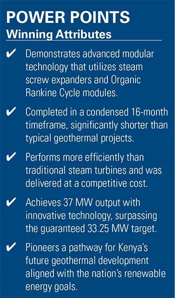 According to Yan, Kaishan’s cost-effective price point proved a crucial selection advantage. Kaishan’s EPC contract is valued at $65 million, compared to a $108 million EPC contract recently awarded for Menengai II, one of the region’s three equally sized IPP projects. The price difference is rooted in the technology selection, Yan explained. While Sosian’s 35-MW project was designed as a centralized power plant, it is powered by two steam screw expanders and three wet steam ORC modular power plants.